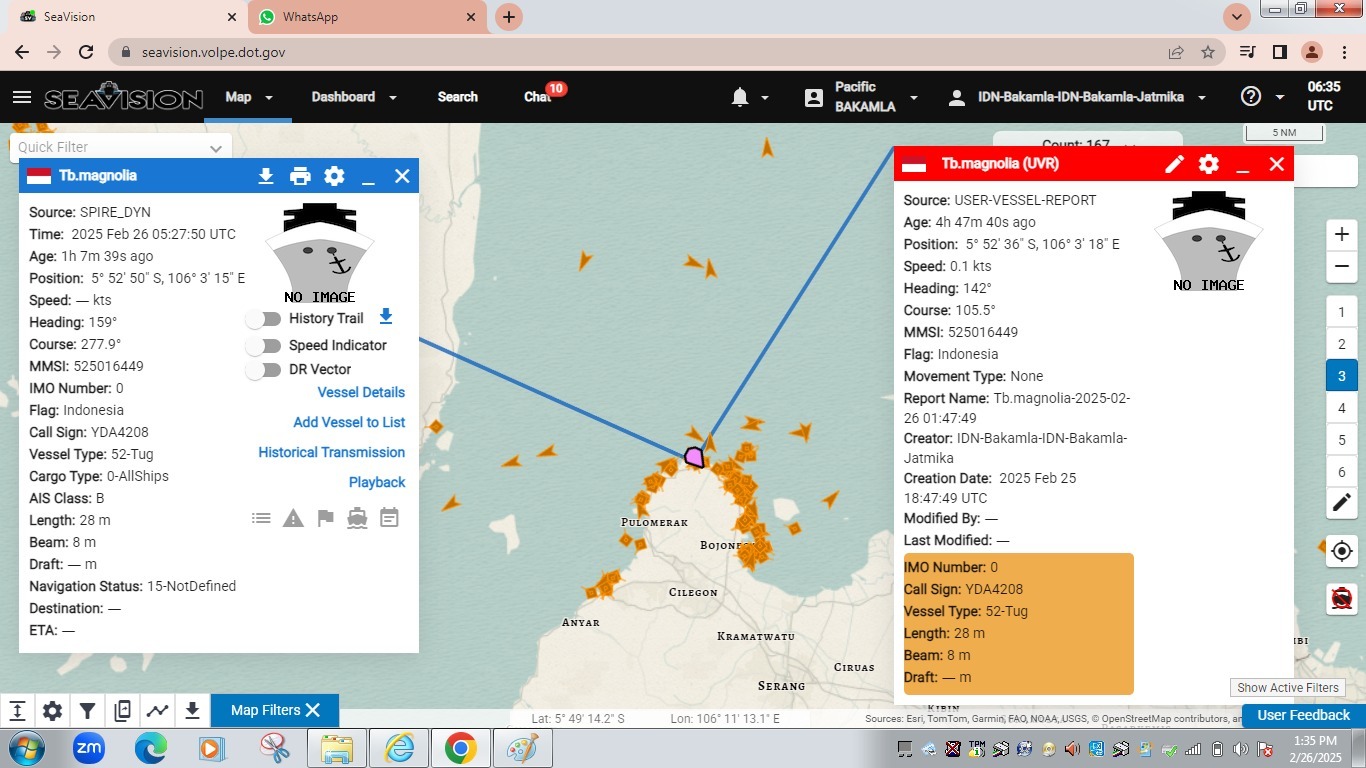 Serang – Bakamla RI melalui KN Tanjung Datu-301 bergerak cepat merespons laporan dari Vessel Traffic Service (VTS) Merak terkait kondisi darurat yang dialami Kapal Tugboat TB Magnolia dengan callsign YDA4208, GT 251, dan LOA 28 meter. Kapal tersebut mengalami kondisi Not Under Command akibat kerusakan kemudi di perairan Salira, Kabupaten Serang, Banten, Rabu (26/2/2025).