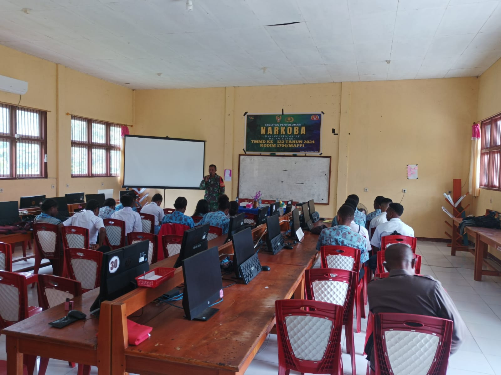 Mappi – Bentuk sinergitas antara TNI dan Polri, Polres Mappi melalui Kasat Binmas Polres Mappi Iptu Naftali Rumpaidus melaksanakan kegiatan penyuluhan Narkoba terhadap siswa-siswi SMK Negeri 2 Obaa, Distrik Obaa, Kabupaten Mappi, Papua Selatan, Kamis (24/10/2024). Kegiatan ini dilaksanakan dalam rangka program non fisik yang dilakukan Satgas TMMD Ke-122 Kodim 1704/Mappi.