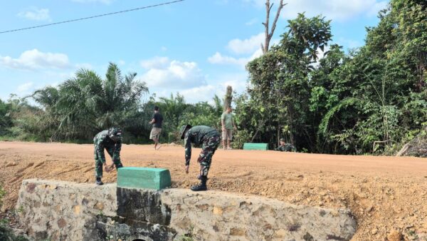 Anggota Satgas TMMD ke-122 dan warga sedang menyelesaikan pembangunan pengecekan,gorong-gorong di ruas jalan di Dusun Aik Dekat, Desa Simpang Pesak, Kecamatan Simpang Pesak Kabupaten Belitung Timur.